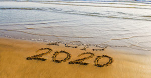 Happy New Year 2020 text on the sea beach. Abstract background photo of coming New Year 2020 and leaving year of 2019
